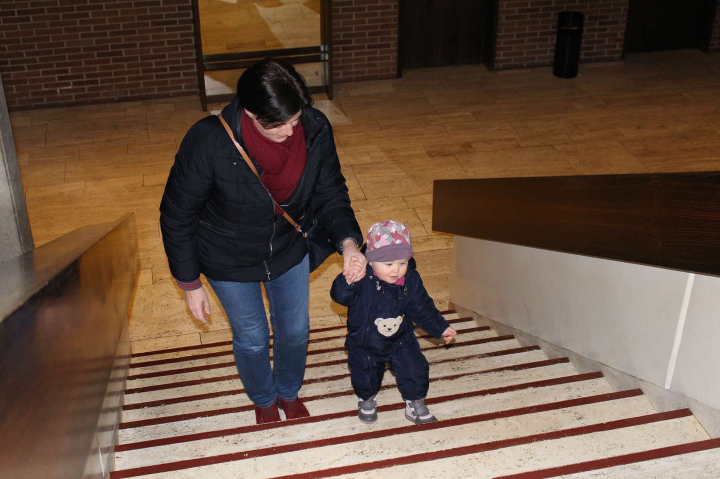 Um im Bürgerhaus der Kernstadt zu den Toiletten oder der Garderobe zu gelangen, müssen ältere, gehbehinderte oder in sonst einer Weise beeinträchtigte Menschen einen beschwerlichen Weg auf sich nehmen. Für Eltern mit Kinderwagen ist dieses Hindernis ohne Hilfe gar nicht zu überwinden, auch kleine Kinder haben ihre liebe Not damit.